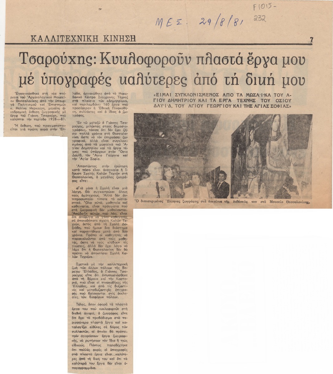 Απόκομμα της εφημερίδας “Μεσημβρινή” (29/08/1981), όπου δημοσιεύεται άρθρο με θέμα την αναδρομική έκθεση του Γιάννη Τσαρούχη, η οποία διεξάγεται στο Αρχαιολογικό Μουσείο Θεσσαλονίκης. Δίνονται αποσπάσματα συνέντευξης του καλλιτέχνη σε δημοσιογράφους, όπου έδωσε την άποψή του αναφορικά με την ίδρυση Σχολής Καλών Τεχνών στην πόλη. Επίσης, σχολίασε την κυκλοφορία πλαστών έργων του στην διεθνή αγορά.