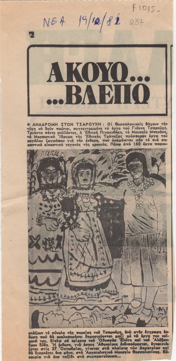 Απόκομμα της εφημερίδας “Τα Νέα” (19/10/1981), όπου δημοσιεύεται άρθρο αναφερόμενου σε αναδρομική έκθεση του Γιάννη Τσαρούχη, η οποία διεξάγεται στο Αρχαιολογικό Μουσείο Θεσσαλονίκης.