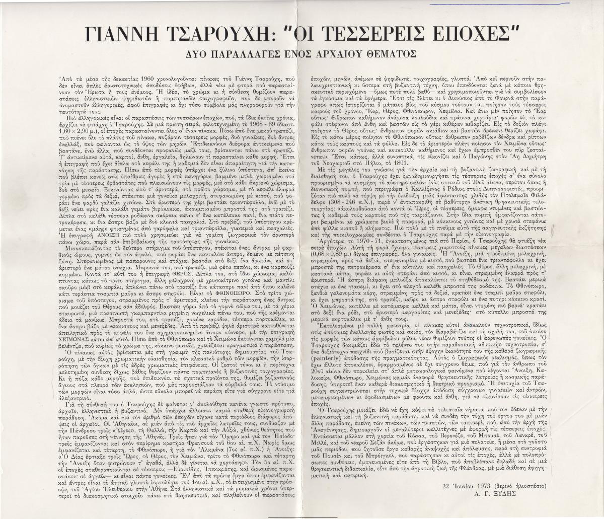 Απόκομμα, χαρτόνι, 31.5×34.5 εκ., στα ελληνικά, δημοσίευσης κριτικής του Α. Γ. Ξύδη, σύνθεσης έργων του Γιάννη Τσαρούχη. Ο κριτικός σχολιάζει τις “Τέσσερις Εποχές” του καλλιτέχνη.