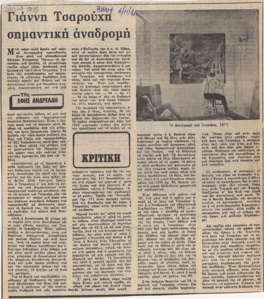 Απόκομμα της εφημερίδας “Το Βήμα” (06/11/1981), όπου δημοσιεύεται κριτική αναδρομικής έκθεσης του Γιάννη Τσαρούχη, η οποία διοργανώνεται από το “Μακεδονικό Κέντρο Σύγχρονης Τέχνης” και διεξάγεται στο Αρχαιολογικό Μουσείο Θεσσαλονίκης.