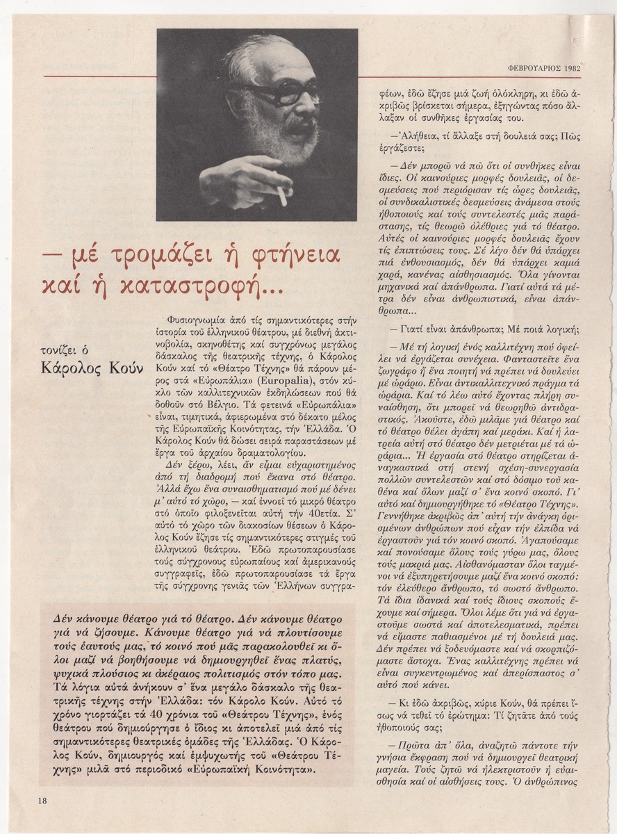 Απόκομμα του περιοδικού “Ευρωπαϊκή Κοινότητα”, τεύχος 02/1982, όπου δημοσιεύεται συνέντευξη του Κάρολου Κουν.