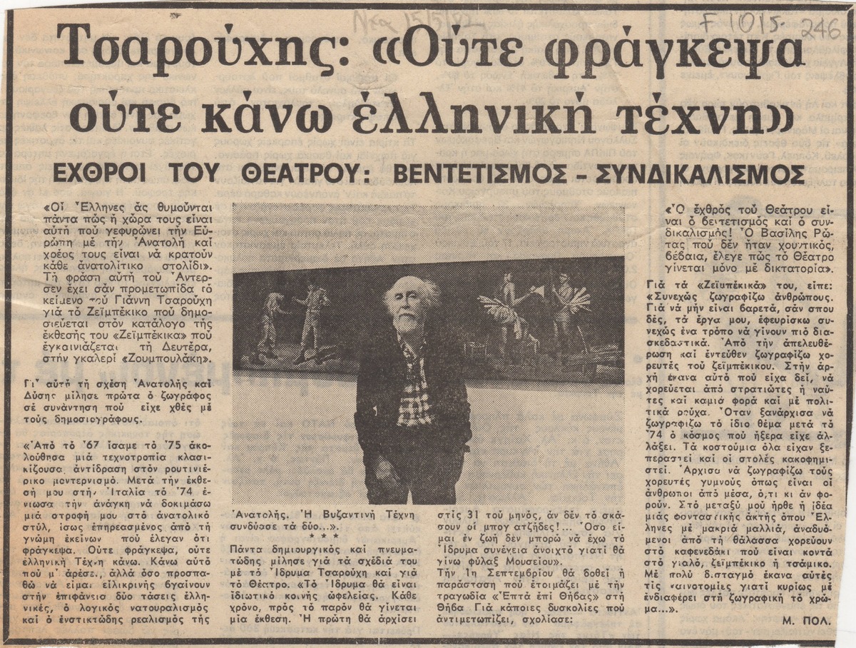 Απόκομμα της εφημερίδας “Τα Νέα” (15/05/1982), όπου δημοσιεύεται άρθρο με θέμα τον Γιάννη Τσαρούχη. Ο καλλιτέχνης, με αφορμή έκθεση με θέμα το Ζεϊμπέκικο στην γκαλερί Ζουμπουλάκη στην Αθήνα, έδωσε συνέντευξη Τύπου στην οποία μίλησε για το έργο που παρουσιάζει και για τη σχέση Ανατολής και Δύσης.
