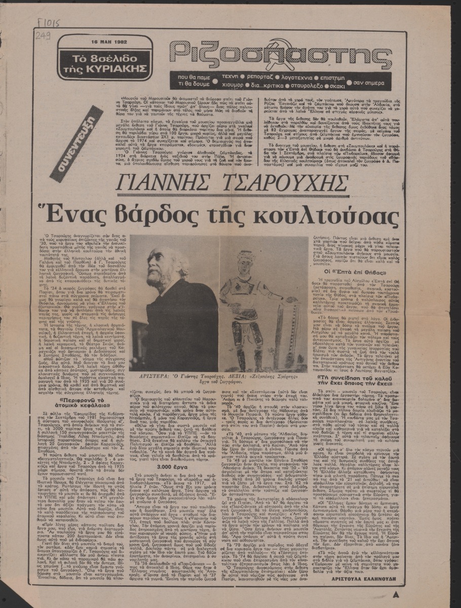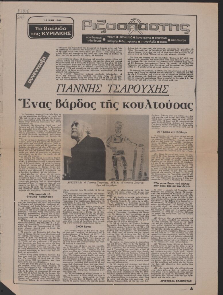 Απόκομμα της εφημερίδας “Ριζοσπάστης” (16/05/1982), όπου δημοσιεύεται συνέντευξη του Γιάννη Τσαρούχη με αφορμή έκθεση με θέμα το “Ζεϊμπέκικο” στην γκαλερί Ζουμπουλάκη στην Αθήνα.