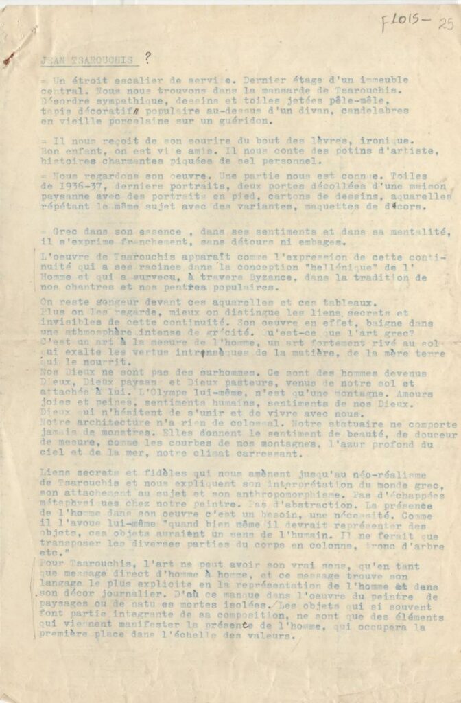 Κείμενο, δακτυλόγραφο, χαρτί, 4 φφ, 29,5×19.5 εκ., στα γαλλικά, για τον Γιάννη Τσαρούχη και το έργο του.