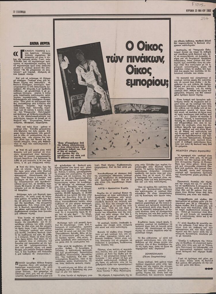 Απόκομμα εφημερίδας (23/05/1982), χαρτί, 43×31 εκ., στα ελληνικά, δημοσίευσης έρευνας για τις ελληνικές γκαλερί. Εξετάζεται κατά πόσο συμβάλλουν στη διάδοση του έργου των καλλιτεχνών, ενώ σχολιάζονται τα κόστη τους. Δίνονται οι απόψεις των Φ. Σερέζη από την “Αργώ”, Μ. Λαμπάκη, Λ. Τούντα, Μ. Μεσολωρά από την “Γκαλερί 3”, Π. Ζουμπουλάκη από την “Ζουμπουλάκη” και Μ. Δημητριάδη από την “Μέδουσα”.