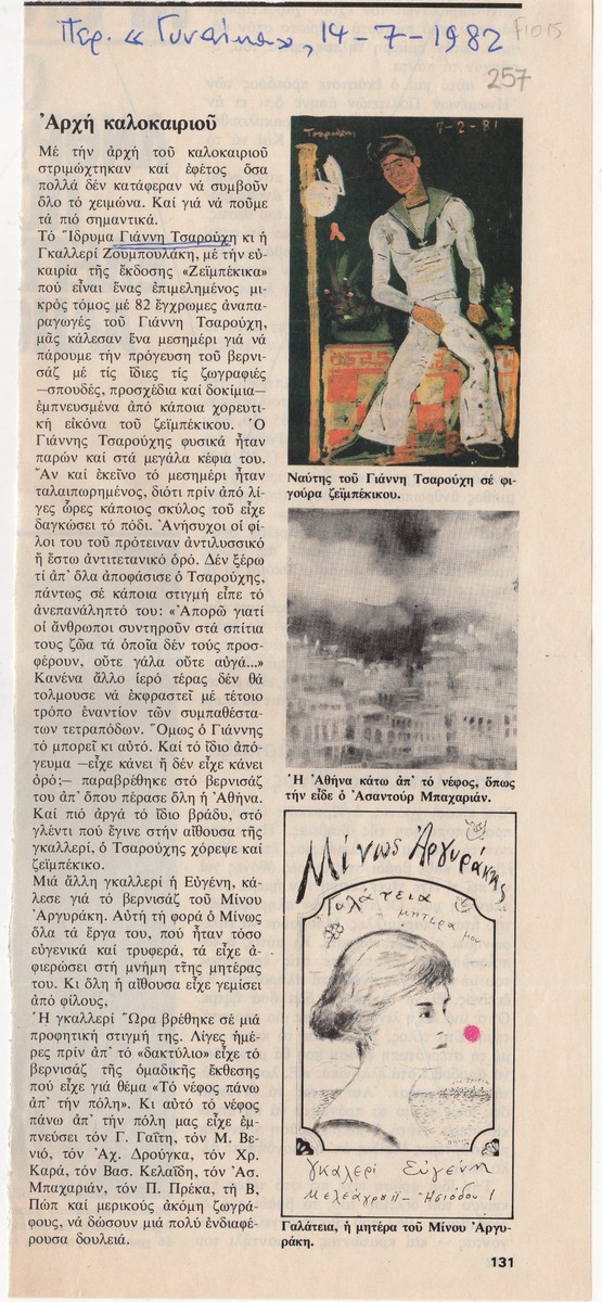 Απόκομμα του περιοδικού “Γυναίκα” (14/07/1982), όπου δημοσιεύεται άρθρο με θέμα τα εγκαίνια έκθεσης και κυκλοφορίας έκδοσης με τίτλο “Ζεϊμπέκικα”, στην γκαλερί Ζουμπουλάκη στην Αθήνα. Τη διοργάνωση ανέλαβαν η γκαλερί και το Ίδρυμα Γιάννη Τσαρούχη, ενώ το παρόν έδωσε ο καλλιτέχνης. Στο ίδιο, αναφορά στα εγκαίνια έκθεσης του Μίνου Αργυράκη στην γκαλερί Ευγένη και στα εγκαίνια ομαδικής έκθεσης με τίτλο “Το νέφος πάνω από την πόλη” στο Καλλιτεχνικό Πνευματικό Κέντρο Ώρα.