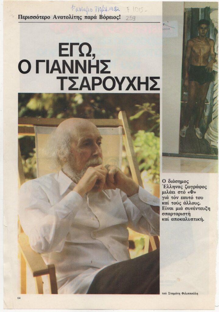 Απόκομμα του περιοδικού “Φαντάζιο” (26/10/1982), όπου δημοσιεύεται συνέντευξη του Γιάννη Τσαρούχη. Ο καλλιτέχνης μιλά για τη ζωή και την καλλιτεχνική του δραστηριότητα.