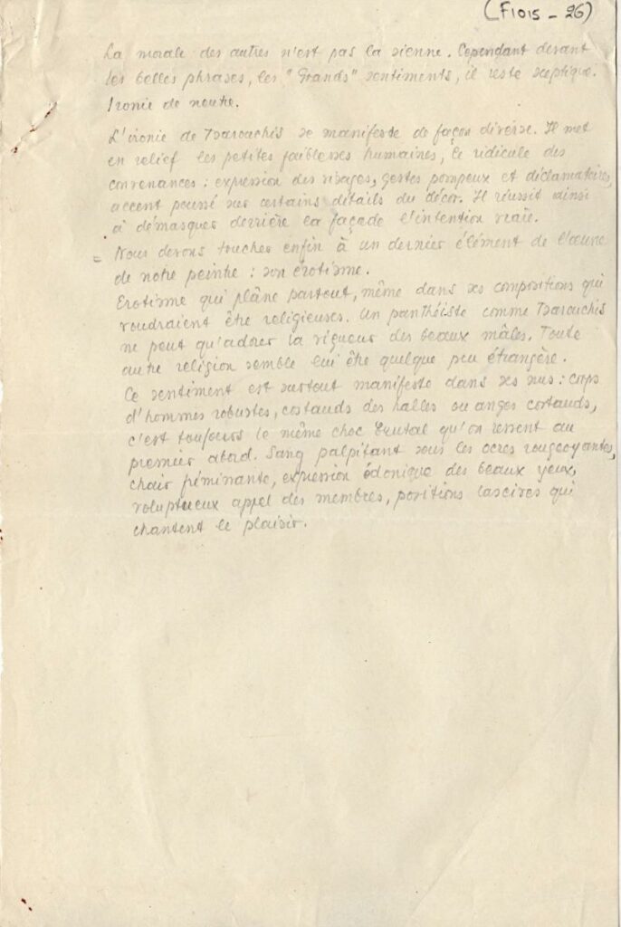 Χειρόγραφο κείμενο του Τώνη Σπητέρη για τον Γιάννη Τσαρούχη, με αφορμή έκθεση του καλλιτέχνη στο Παρίσι. Σκιαγραφείται το πορτραίτο του καλλιτέχνη.