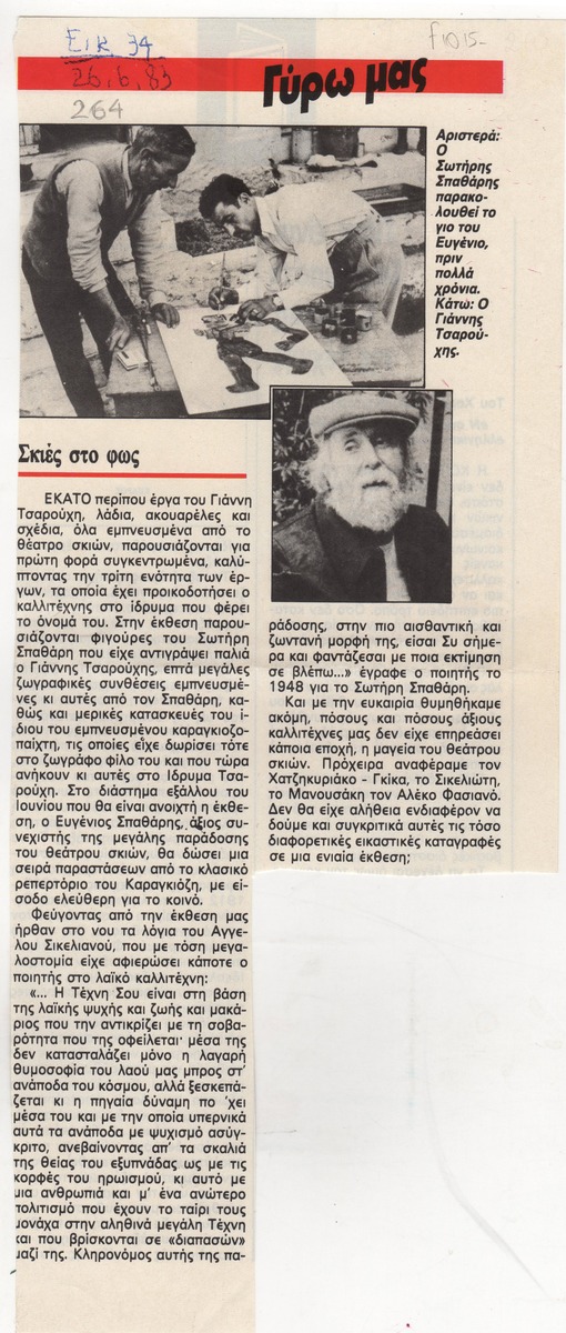 Απόκομμα του περιοδικού “Εικόνες” (26/06/1983), όπου δημοσιεύεται άρθρο που αναφέρεται σε έκθεση έργων του Γιάννη Τσαρούχη και σε φιγούρες του Σωτήρη Σπαθάρη, που ενέπνευσαν τον καλλιτέχνη, η οποία διεξάγεται στο ίδρυμα Γιάννη Τσαρούχη.
