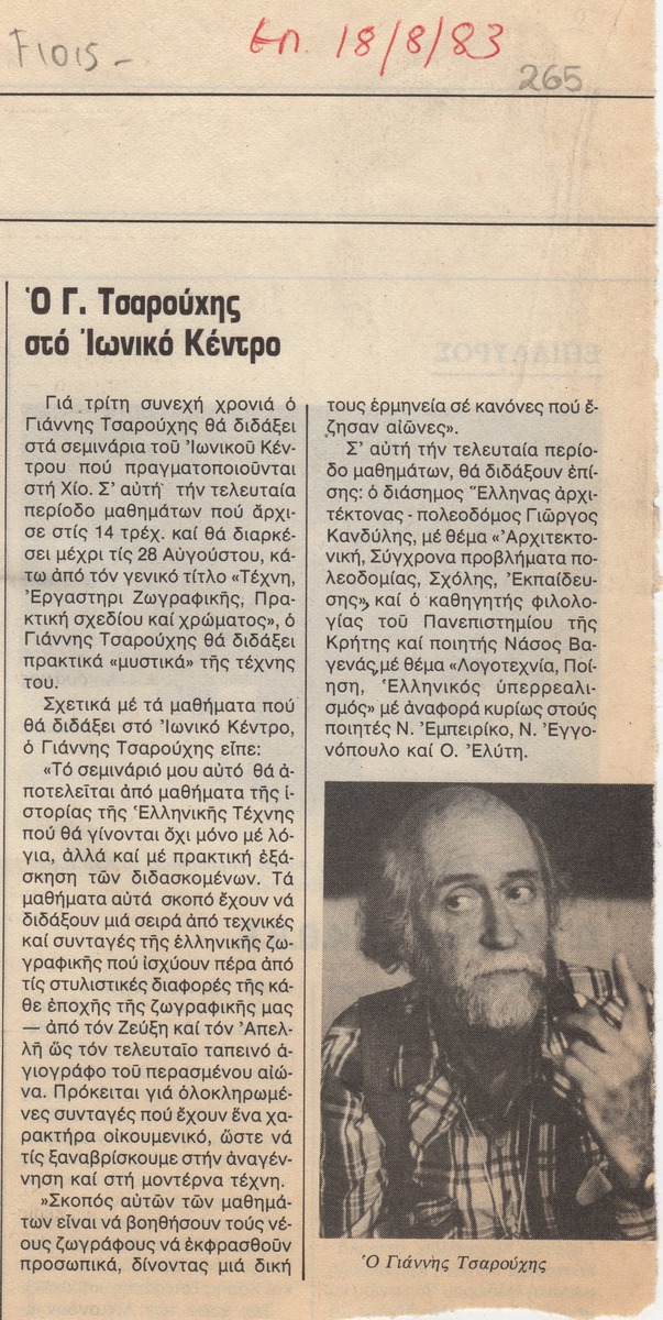 Απόκομμα του περιοδικού “Επίκαιρα” (18/08/1983), όπου δημοσιεύεται άρθρο με θέμα τον κύκλο διαλέξεων του Γιάννη Τσαρούχη στη Χίο, με τον τίτλο “Τέχνη, Εργαστήρι Ζωγραφικής, Πρακτική Σχεδίου και Χρώματος”.