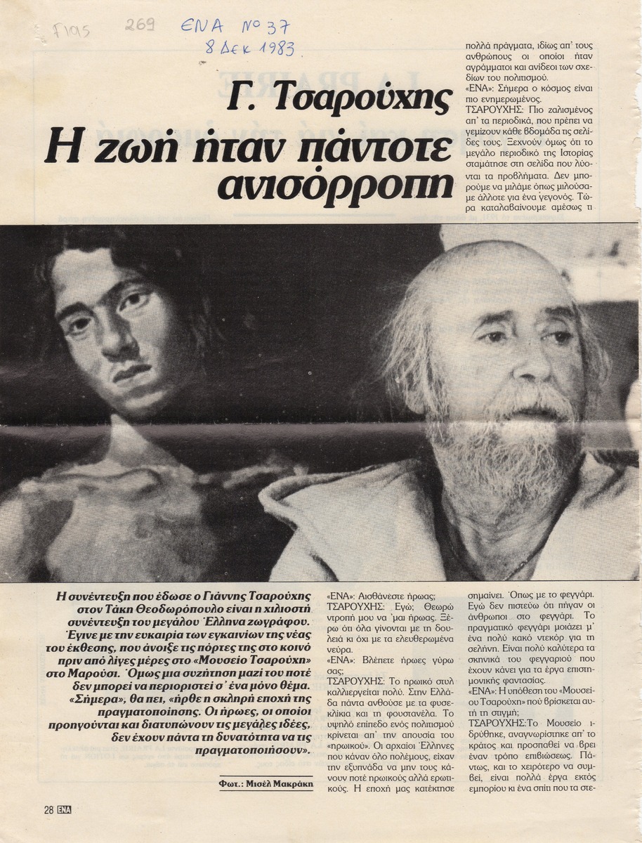 Απόκομμα του περιοδικού “Ένα”, τεύχος 37, (08/12/1983), όπου δημοσιεύεται συνέντευξη του Γιάννη Τσαρούχη, με αφορμή έκθεση στο “Μουσείο Τσαρούχη”.