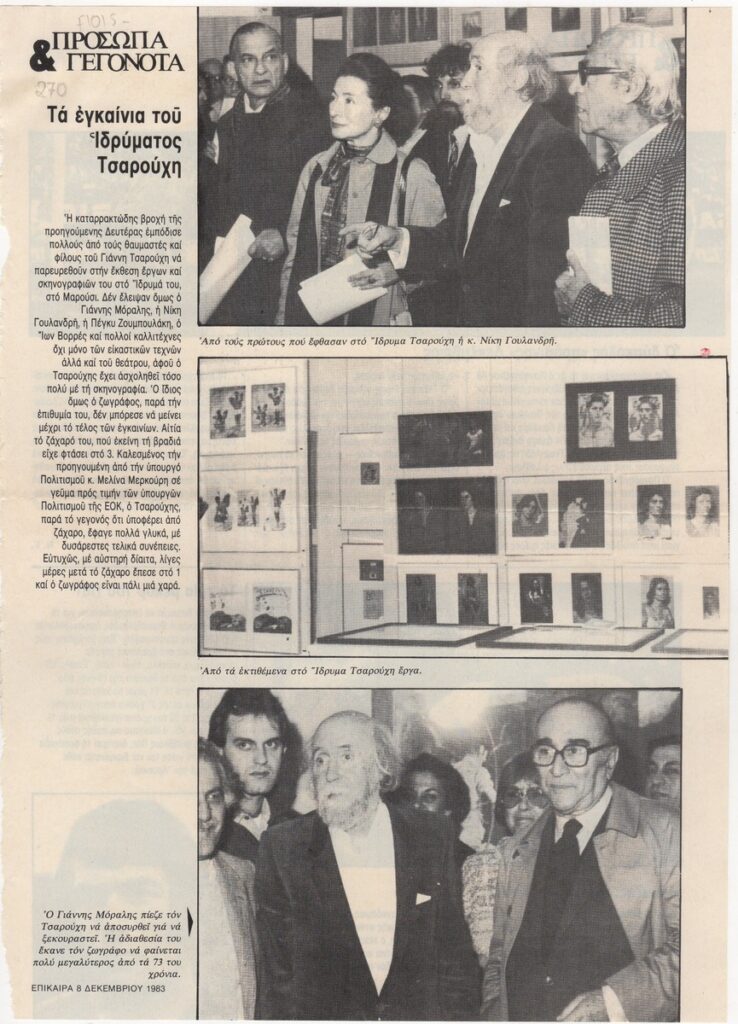 Απόκομμα του περιοδικού “Ένα” (08/12/1983), όπου δημοσιεύεται άρθρο με θέμα τα εγκαίνια του Ιδρύματος Τσαρούχη. Δίνονται λεπτομέρειες για την εκδήλωση και τα πρόσωπα που τίμησαν τον καλλιτέχνη με την παρουσία τους.