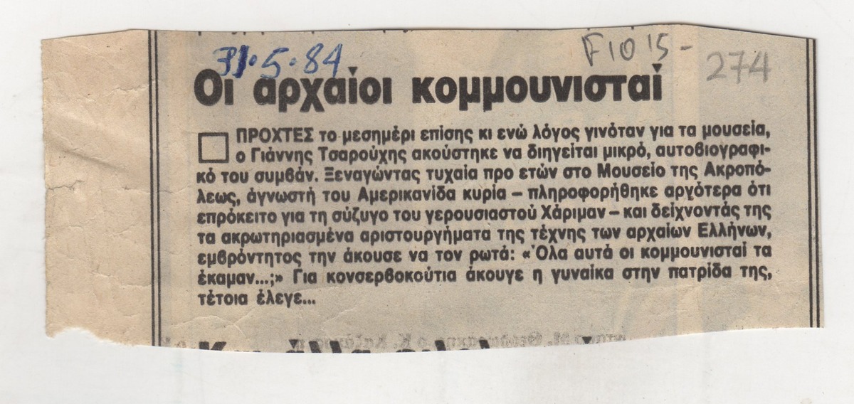 Απόκομμα εφημερίδας (31/05/1984), όπου δημοσιεύεται άρθρο με θέμα μία διήγηση του Γιάννη Τσαρούχη. Ο καλλιτέχνης εξιστορεί την έκπληξη Αμερικανίδας που ξεναγούσε στο Μουσείο της Ακρόπολης όταν αντίκρισε έργα αρχαιοελληνικής Τέχνης.