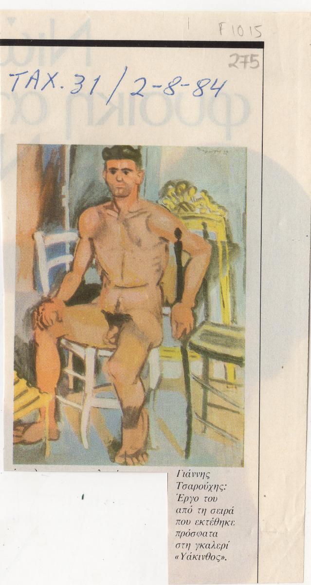 Απόκομμα, χαρτί ακανόνιστου μεγέθους, στα ελληνικά, δημοσίευσης αναπαραγωγής έργου του Γιάννη Τσαρούχη.