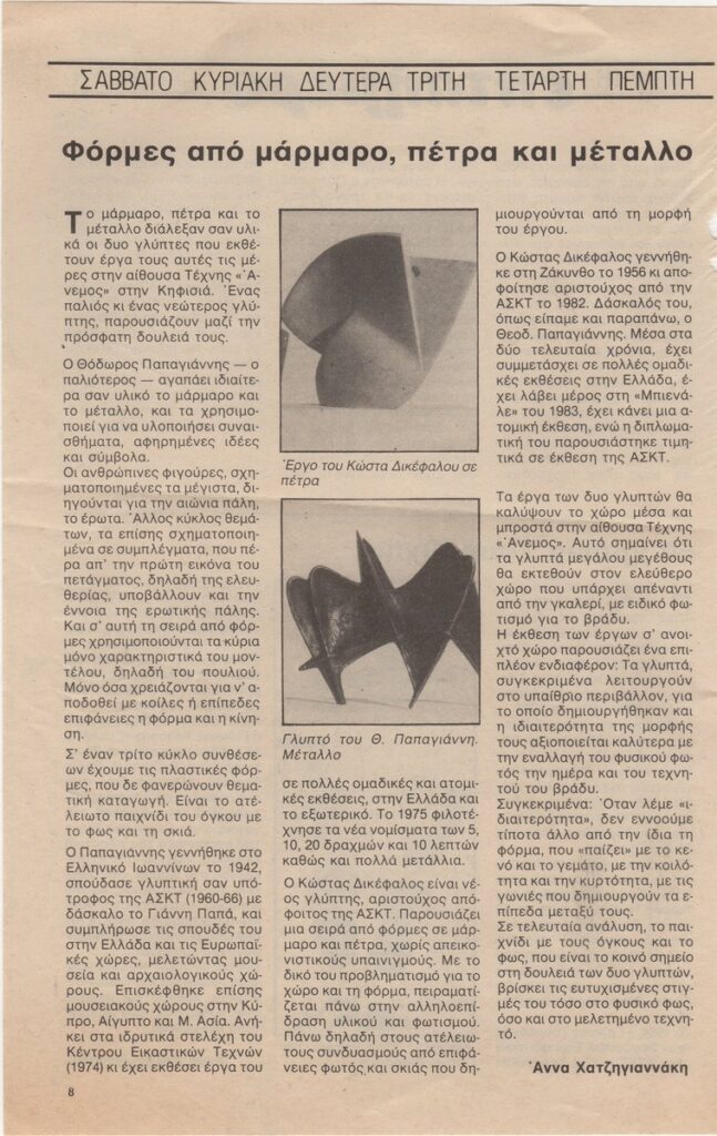 Απόκομμα του περιοδικού “Αθηνόραμα” (03/05/1984), όπου δημοσιεύεται άρθρο με θέμα την έκθεση γλυπτικής των Θόδωρου Παπαγιάννη και Κώστα Δικέφαλου, στην Αίθουσα Τέχνης Άνεμος στην Αθήνα. Δίνονται βιογραφικές πληροφορίες για τους καλλιτέχνες.