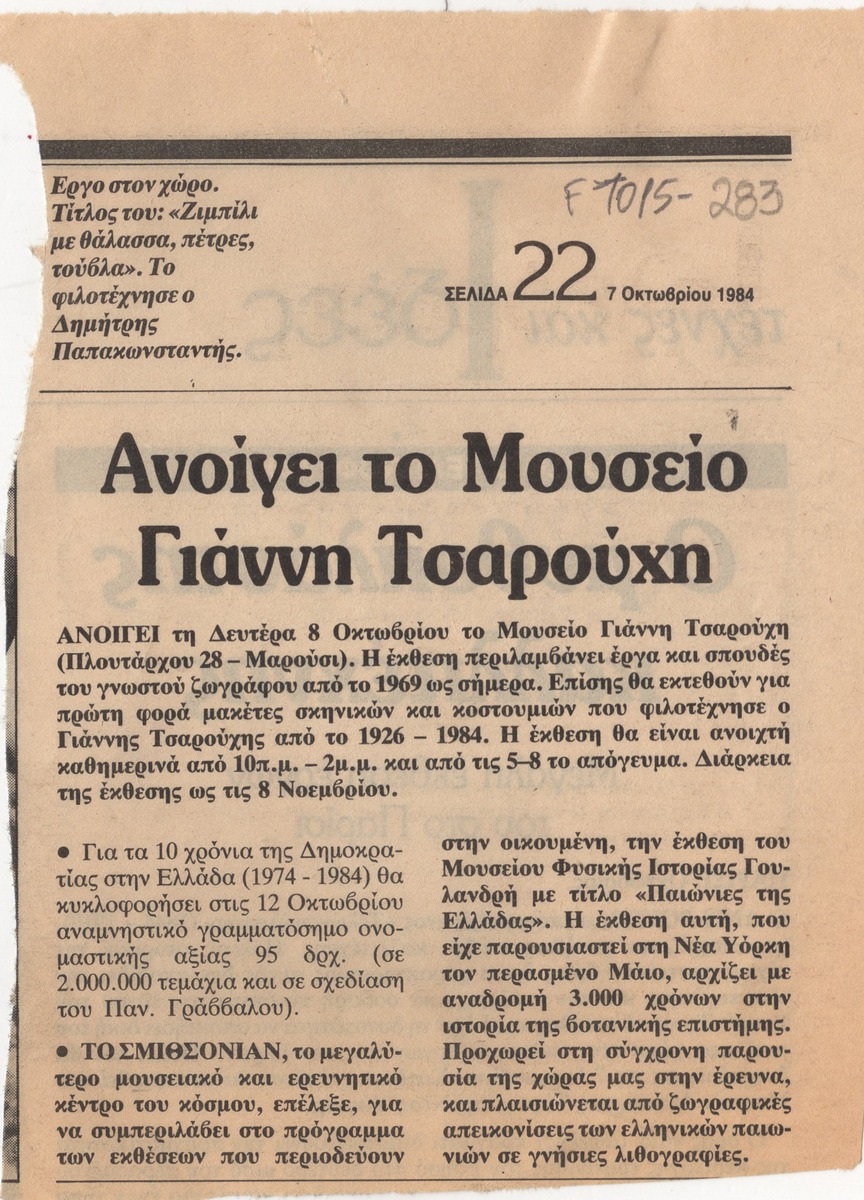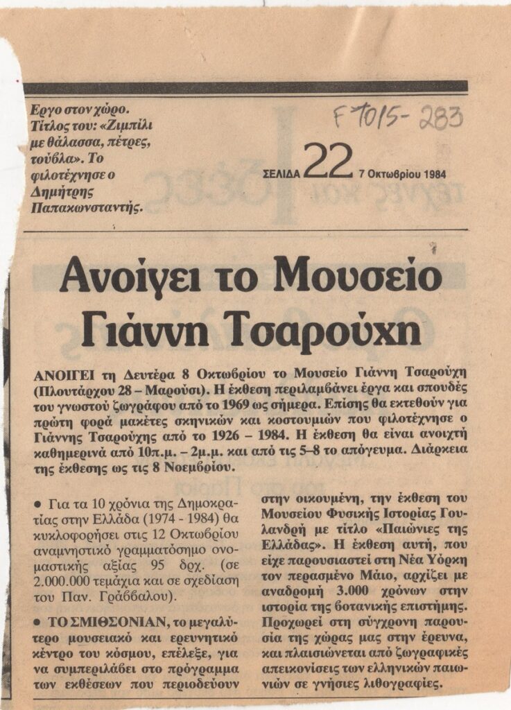 Απόκομμα της εφημερίδας “Το Βήμα” (07/10/1984), όπου δημοσιεύεται άρθρο με θέμα τα εγκαίνια του “Μουσείου Τσαρούχη”, στο πλαίσιο των οποίων πραγματοποιείται έκθεση έργων του καλλιτέχνη, με ζωγραφικά έργα, μακέτες κουστουμιών και σκηνικών.