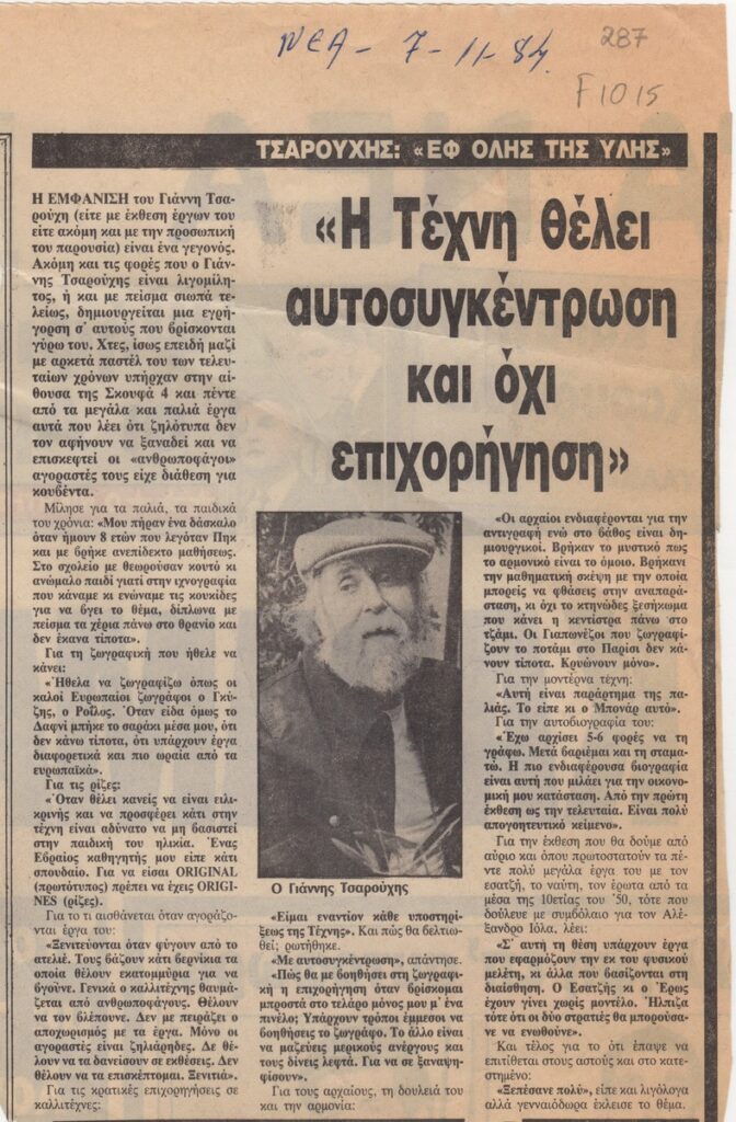 Απόκομμα της εφημερίδας “Τα Νέα” (07/11/1984), όπου δημοσιεύεται άρθρο που μεταφέρει απόψεις του Γιάννη Τσαρούχη για τη ζωγραφική και την Τέχνη. Αφορμή στάθηκε έκθεση του καλλιτέχνη στην γκαλερί “Σκουφά 4”.