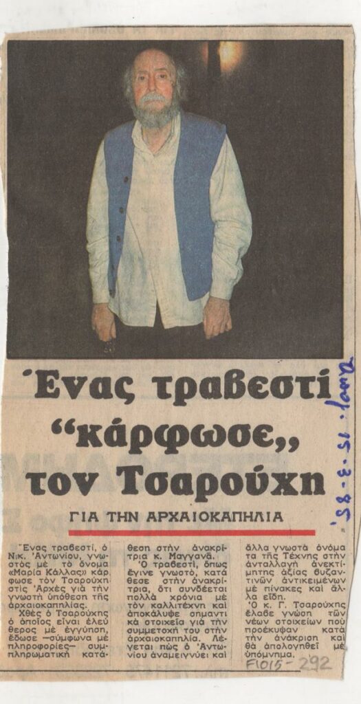 Απόκομμα, χαρτί, 18.5×10.5 εκ., στα ελληνικά, δημοσίευσης άρθρου αναφερόμενου σε καταγγελία που δέχτηκε ο Γιάννης Τσαρούχης για αρχαιοκαπηλία.