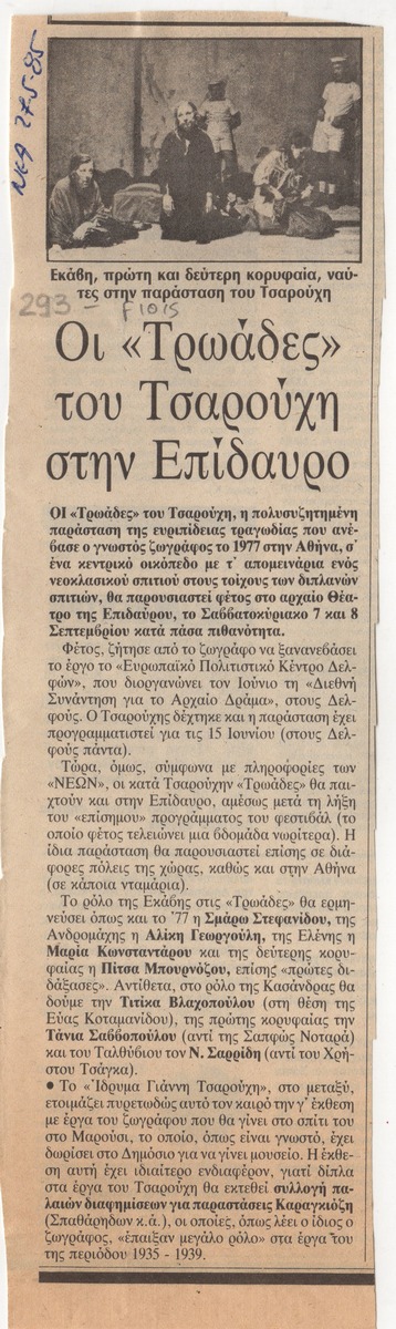 Απόκομμα της εφημερίδας “Τα Νέα” (27/05/1985), όπου δημοσιεύεται άρθρο με θέμα την τραγωδία “Τρωάδες” που ανεβαίνει στην Επίδαυρο σε σκηνοθεσία Γιάννη Τσαρούχη. Δίνονται πληροφορίες για το έργο και τους συντελεστές του.