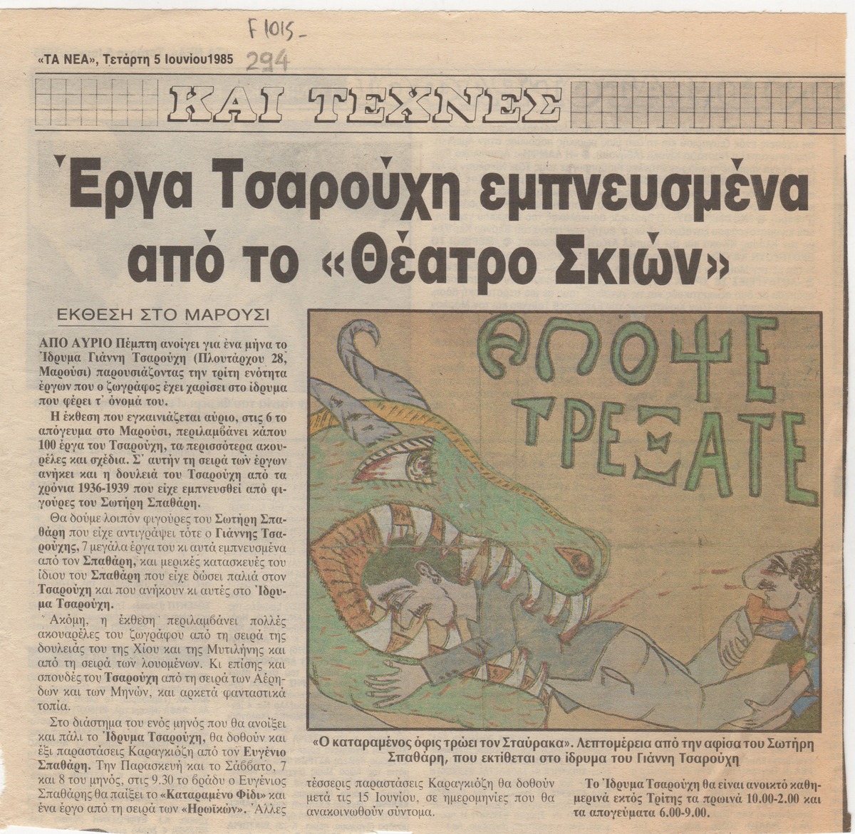 Απόκομμα της εφημερίδας “Τα Νέα” (05/06/1985), όπου δημοσιεύεται άρθρο με θέμα την έκθεση του Γιάννη Τσαρούχη, η οποία διεξάγεται στο “Ίδρυμα Τσαρούχη” στην Αθήνα. Σημειώνεται πως παρουσιάζονται έργα του καλλιτέχνη εμπνευσμένα από φιγούρες του Σωτήρη Σπαθάρη. Ακόμη, αναγγέλλονται παραστάσεις του Καραγκιόζη που θα δοθούν στο ίδρυμα από τον Ευγένιο Σπαθάρη.
