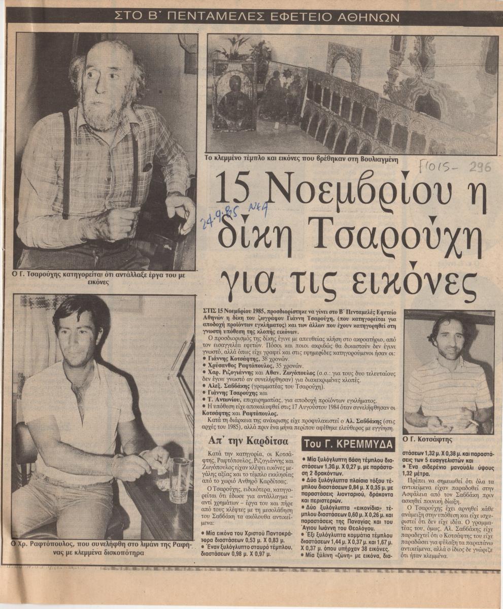 Απόκομμα, χαρτί, 27×22 εκ., στα ελληνικά, δημοσίευσης άρθρου αναφερόμενου στις κατηγορίες εις βάρος του Γιάννη Τσαρούχη για υπόθεση κλοπής εικόνων.