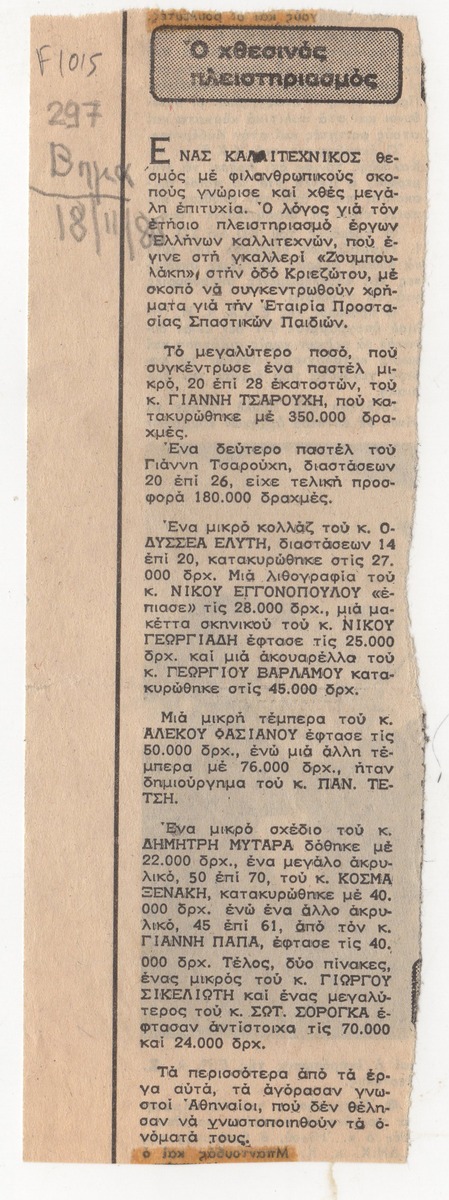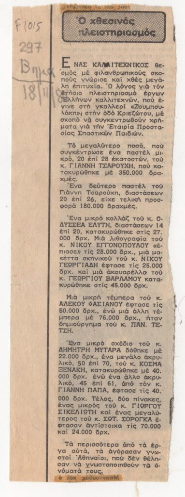 Απόκομμα της εφημερίδας “Το Βήμα” (18/11/1985), όπου δημοσιεύεται άρθρο με θέμα πλειστηριασμό έργων Ελλήνων καλλιτεχνών που πραγματοποιήθηκε στην γκαλερί Ζουμπουλάκη στην Αθήνα.