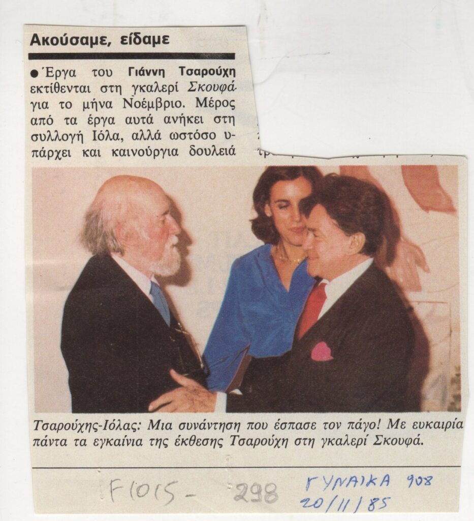 Απόκομμα της περιοδικού “Γυναίκα” (20/11/1985), όπου δημοσιεύεται άρθρο με θέμα την έκθεση του Γιάννη Τσαρούχη στην Αίθουσα “Σκουφά” στην Αθήνα.