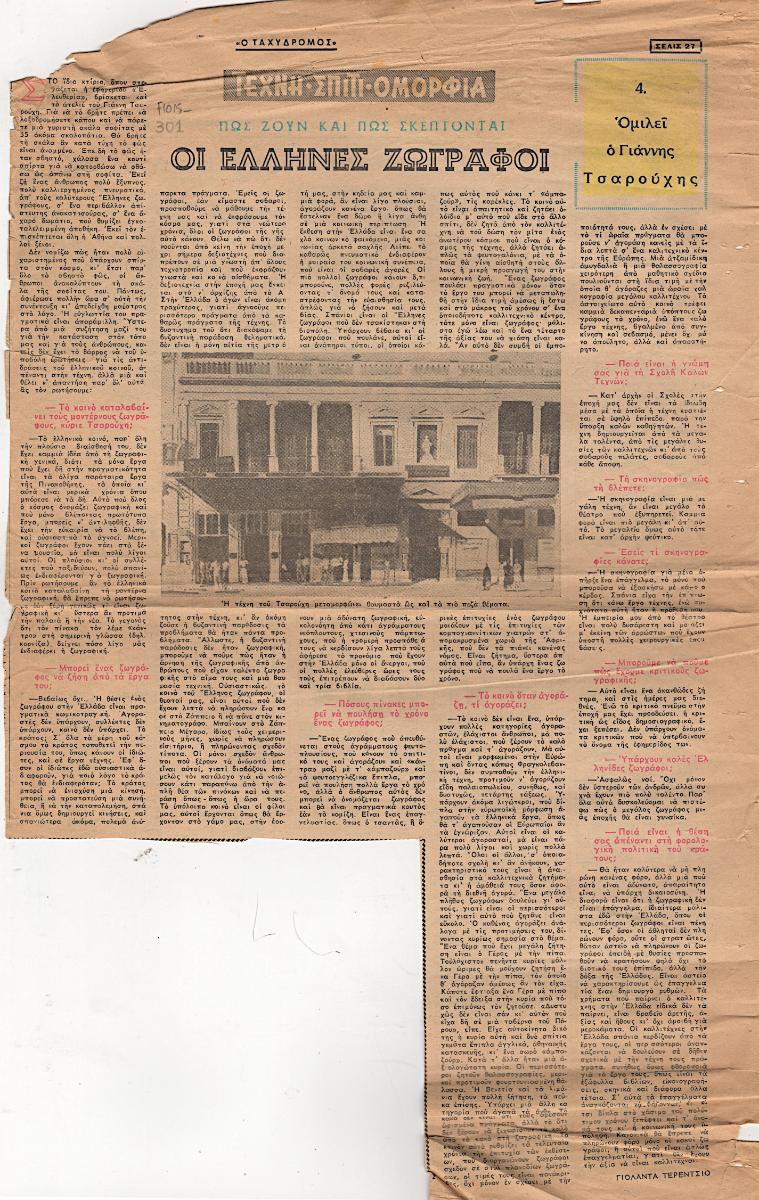 Απόκομμα του περιοδικού “Ο Ταχυδρόμος”, όπου δημοσιεύεται συνέντευξη του Γιάννη Τσαρούχη. Ο καλλιτέχνης μιλά για το κατά πόσο ένας καλλιτέχνης μπορεί να ζήσει μόνο από την καλλιτεχνική δραστηριότητα.