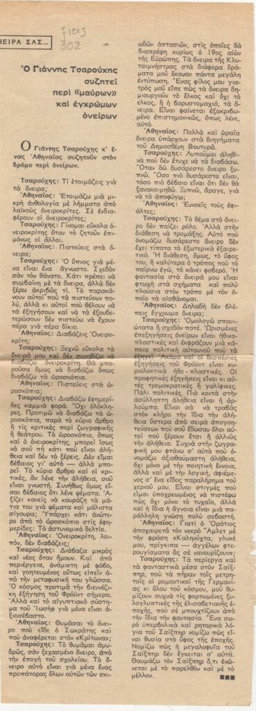 Απόκομμα περιοδικού, όπου δημοσιεύεται συνέντευξη του Γιάννη Τσαρούχη με θέμα τα όνειρα.
