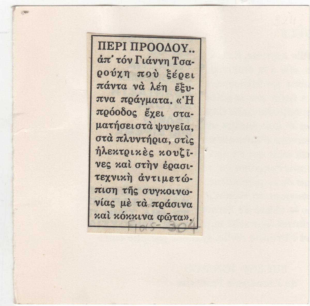 Απόκομμα εντύπου, χαρτί συρραμμένο σε έντυπο, 10,5×10,5 εκ., στα ελληνικά, δημοσίευσης άρθρου για τον Γιάννη Τσαρούχη. Σχολιάζεται άποψη του καλλιτέχνη.