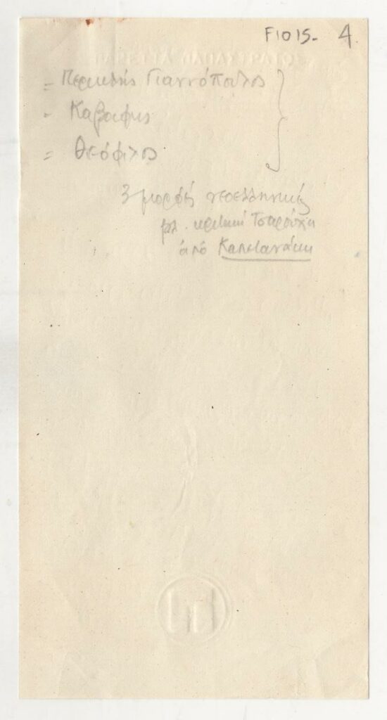 Χειρόγραφη σημείωση του Τώνη Σπητέρη, χαρτί, 17,5×9 εκ., στα ελληνικά, με βιβλιογραφική παραπομπή σε κριτική που ασκήθηκε στον Γιάννη Τσαρούχη. Αναγράφονται τα ονόματα των Γιαννόπουλου, Καβάφη, Θεόφιλου.