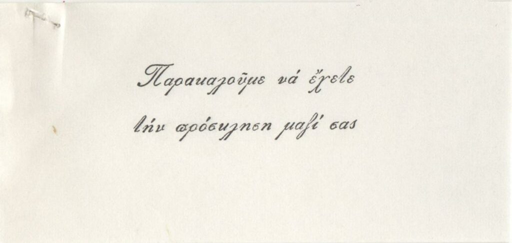 Έντυπη σημείωση, που συνοδεύει πρόσκληση εγκαινίων έκθεσης του Γιάννη Τσαρούχη.