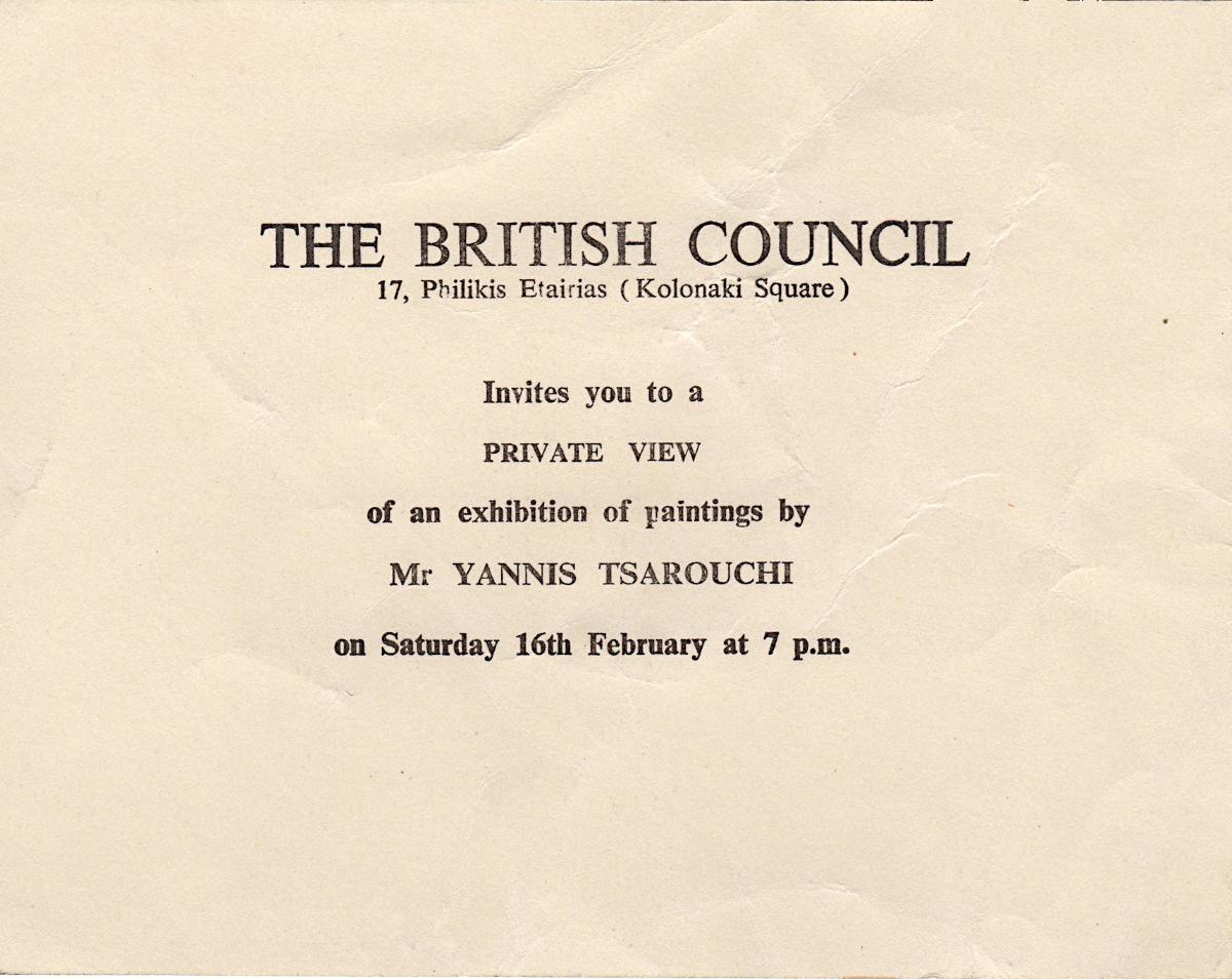 Πρόσκληση σε ιδιωτική προβολή έργων έκθεσης του Γιάννη Τσαρούχη στο Βρετανικό Συμβούλιο στην Αθήνα.