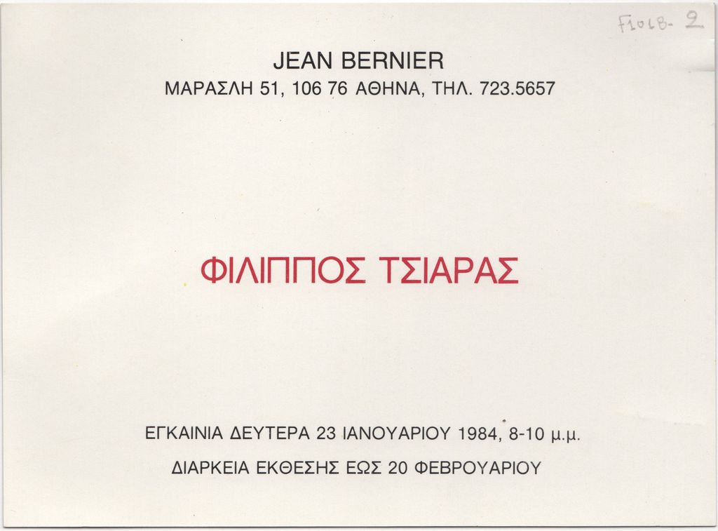 Έντυπο, στα ελληνικά, μονόφυλλο, χαρτόνι, δύο όψεις, 11,0×15,0 εκ. Πρόσκληση της ατομικής έκθεσης του Φίλιππου Τσιάρα στην Αθήνα το 1984. Στη μία όψη, εικονογράφηση.
