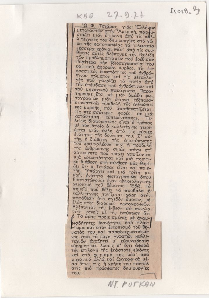 Αποκόμματα, έντυπο, χαρτί, 2 τμήματα, 13,0×5,5 και 3,5×6,0 εκ., όπου δημοσιεύεται, στα ελληνικά, κριτική της ατομικής έκθεσης φωτογραφίας του Φίλιππου Τσιάρα.
