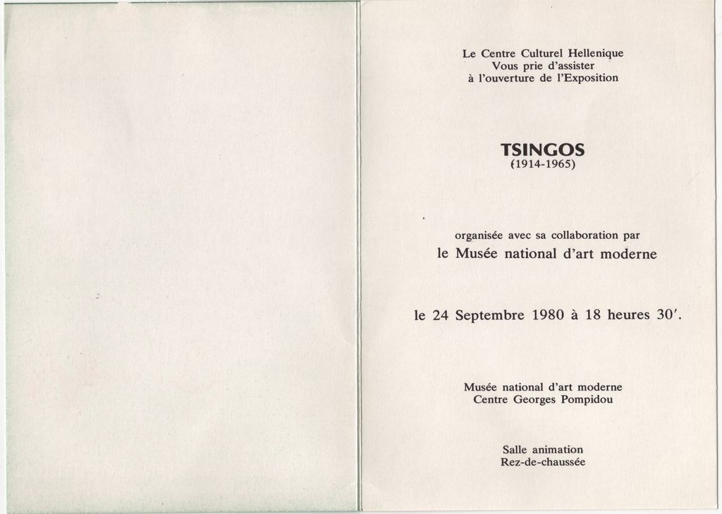 Έντυπο, στα γαλλικά, δίπτυχο, χαρτόνι, 17,0×12,0 εκ. Πρόσκληση των εγκαινίων της αναδρομικής έκθεσης έργων του Θάνου Τσίγκου στο Παρίσι το 1980.