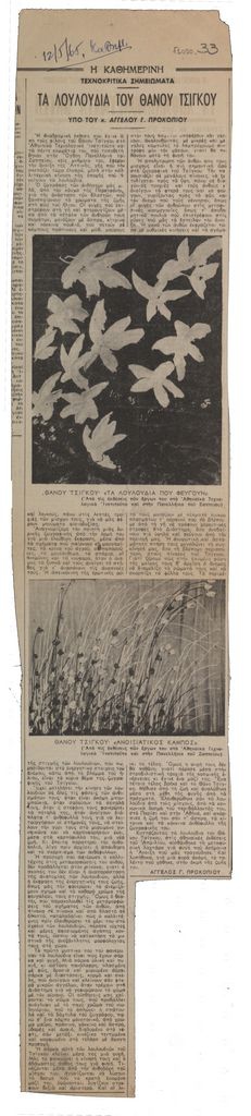 Απόκομμα, έντυπο, χαρτί, 53,7×10,8 εκ., όπου δημοσιεύεται, στα ελληνικά, κριτική του Άγγελου Γ. Προκοπίου για την αναδρμική έκθεση έργων του Θάνου Τσίγκου στην αίθουσα του Αθηναϊκού Τεχνολογικού Ινστιτούτου το 1965.