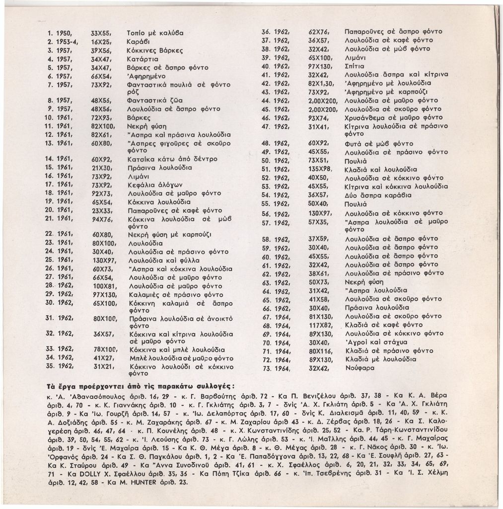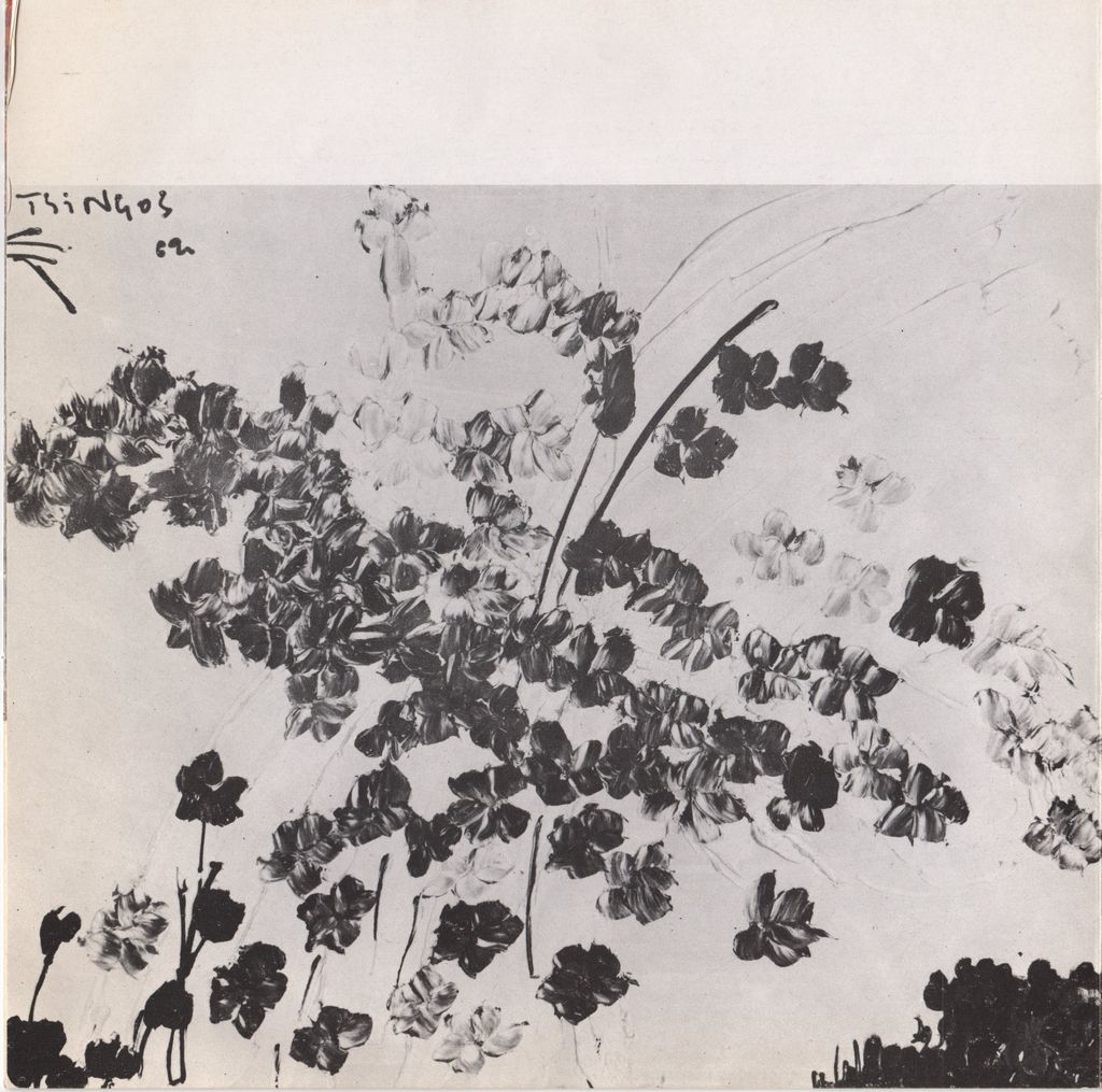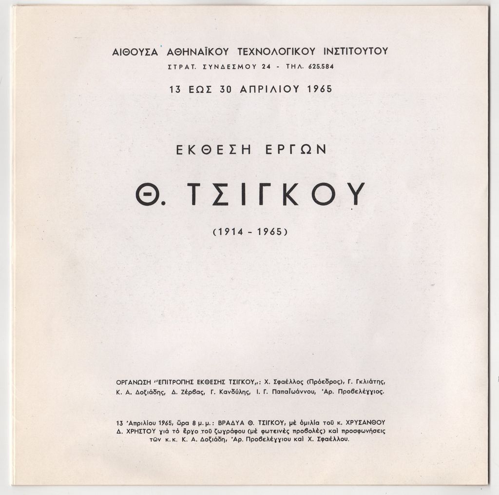 Έντυπο, στα ελληνικά, τρίπτυχο, χαρτόνι ιλουστρασιόν, 22,0×22,0 εκ. Φυλλάδιο της αναδρομικής έκθεσης έργων του Θάνου Τσίγκου, που διοργάνωσε η “Επιτροπή Έκθεσης Θ. Τσίγκου” στην Αθήνα το 1965. Περιέχει κείμενο του Χρύσανθου Χρήστου και κατάλογο έργων της έκθεσης.