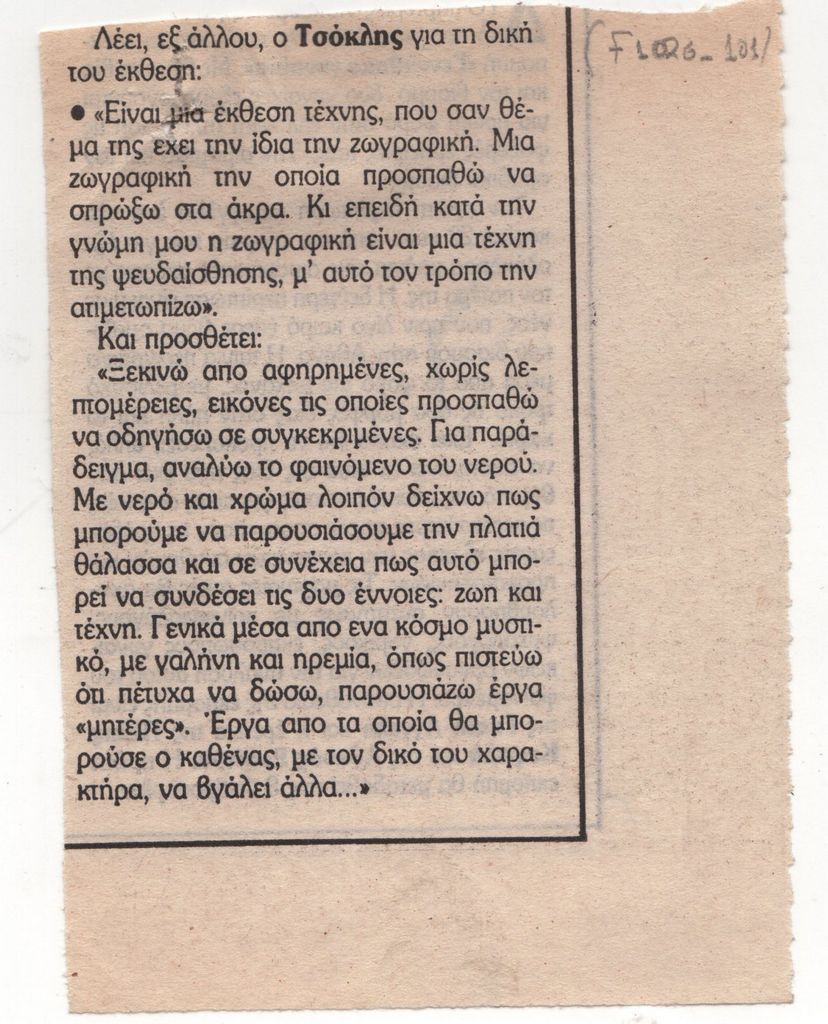 Απόκομμα, έντυπο, χαρτί, 11,0×8,2 εκ., όπου δημοσιεύεται, στα ελληνικά, απόσπασμα συνέντευξης του Κώστα Τσόκλη, με αφορμή ατομική έκθεση έργων του.