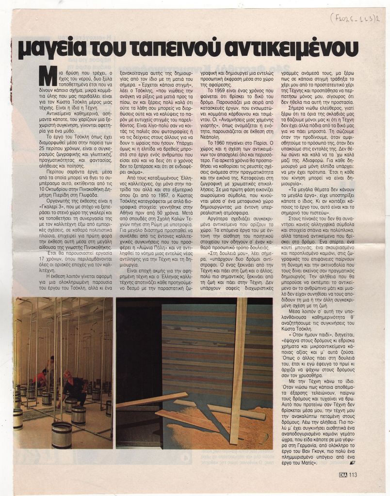 Απόκομμα, έντυπο, χαρτί, 2 φφ., 30,0×23,0 εκ., όπου δημοσιεύεται, στα ελληνικά, άρθρο της Κίτσας Μπόντζου για τον Κώστα Τσόκλη με αφορμή την αναδρομική έκθεση έργων της περιόδου 1966-1983 στην Αθήνα το 1983