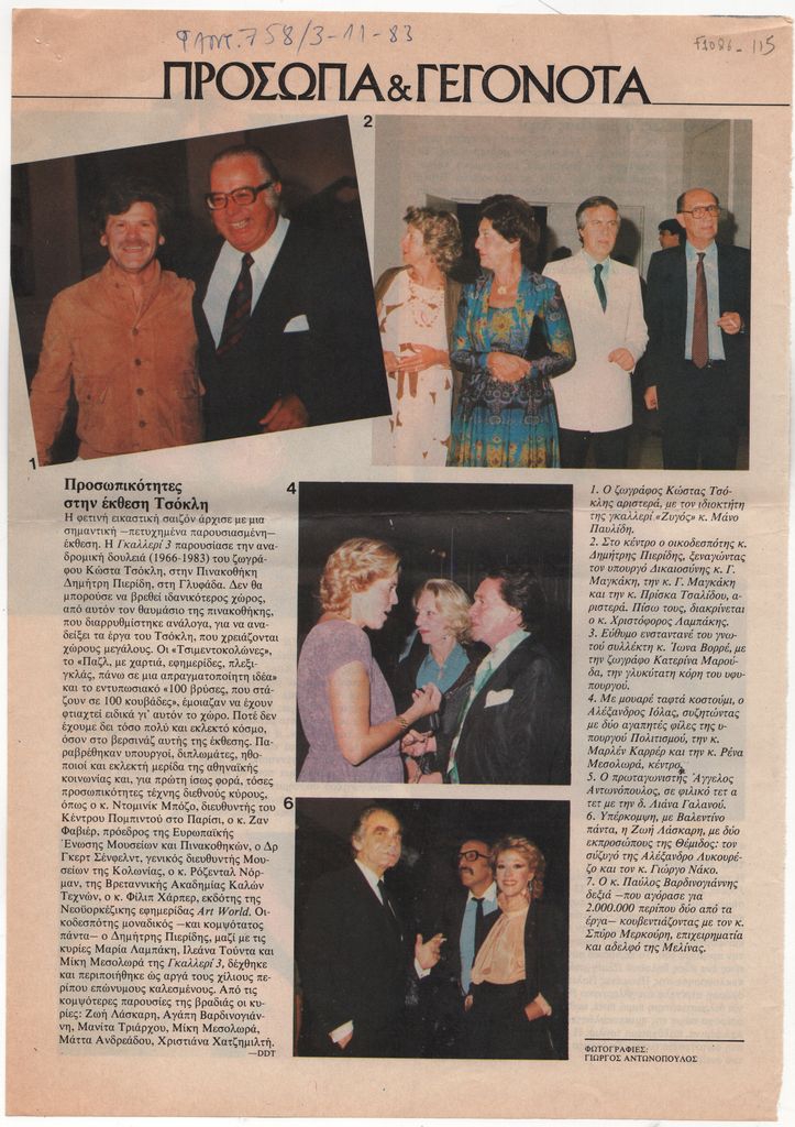 Αποκόμματα, έντυπο, χαρτί, 2 τμήματα, 30,0×21,0 και 30,0×11,0 εκ., όπου δημοσιεύεται φωτορεπορτάζ για τα εγκαίνια της αναδρομικής έκθεσης του Κώστα Τσόκλη στην Αθήνα το 1983.