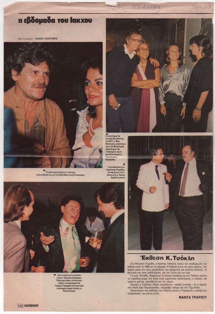 Απόκομμα, έντυπο, χαρτί ιλουστρασιόν, 62,5×22,0 εκ., όπου δημοσιεύεται, στα ελληνικά, φωτορεπορτάζ της Μανίτας Τριάρχου από τα εγκαίνια της ατομικής έκθεσης του Κώστα Τσόκλη στην Αθήνα το 1983. Εντάσσεται στη στήλη “Η εβδομάδα του Ίακχου”.