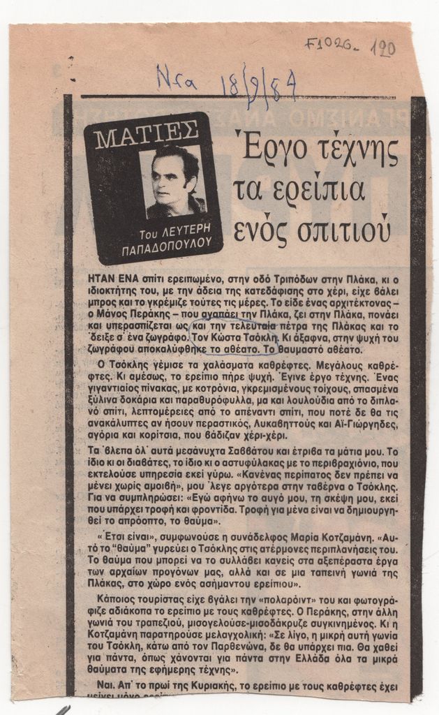 Απόκομμα, έντυπο, χαρτί, 18,3×11,3 εκ., όπου δημοσιεύεται, στα ελληνικά, άρθρο του Λευτέρη Παπαδόπουλου για την εικαστική παρέμβαση του Κώστα Τσόκλη σε μισογκρεμισμένο σπίτι στην Πλάκα το 1984.