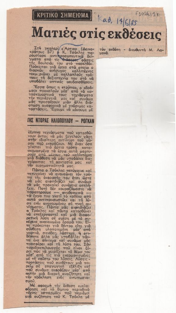 Απόκομμα, έντυπο, χαρτί, 22,0×11,5 εκ., όπου δημοσιεύεται, στα ελληνικά, κριτική της Ντόρας Ηλιοπούλου-Ρογκάν για την ατομική έκθεση του Κώστα Τσόκλη στη γκαλερί Άρτιο στην Αθήνα το 1985. Εντάσσεται στη στήλη “Ματιές στις εκθέσεις”.