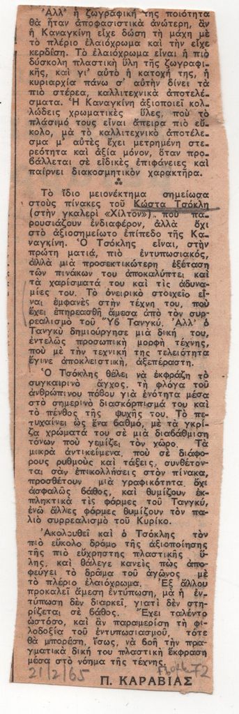 Απόκομμα, έντυπο, χαρτί, 17,3×5,7 εκ., όπου δημοσιεύεται, στα ελληνικά, κριτικό σημείωμα του Πάνου Καραβία για την ατομική έκθεση του Κώστα Τσόκλη στην Αθήνα το 1965. Στο ίδιο άρθρο, απόσπασμα κριτικής για ατομική έκθεση της Νίκης Καναγκίνη.