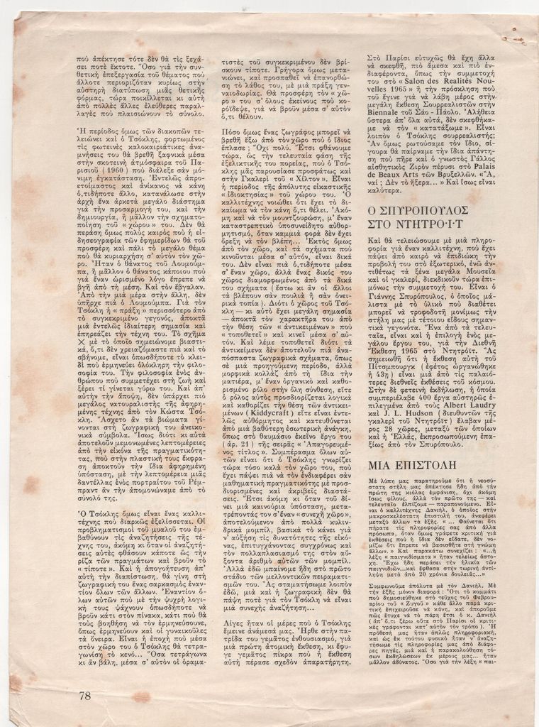 Απόκομμα, έντυπο, χαρτί ιλουστρασιόν, 27,8×20,3 εκ., όπου δημοσιεύεται, στα ελληνικά, άρθρο της Μαρίας Κοτζαμάνη για τον Κώστα Τσόκλη. Στο ίδιο απόκομμα, σύντομα άρθρα της Μ. Κοτζαμάνη με τίτλο “Ο Σπυρόπουλος στο Ντητρόιτ” και “Μία επιστολή” (του ζωγράφου Δανιήλ).