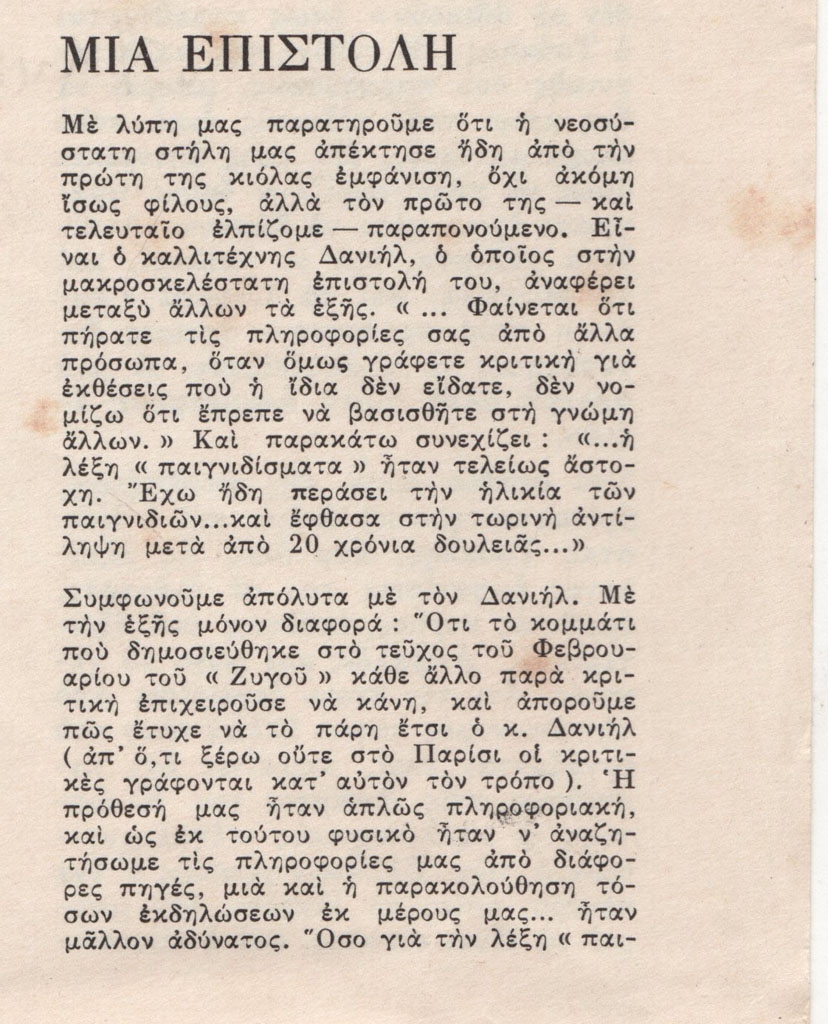Απόκομμα, έντυπο, χαρτί ιλουστρασιόν, 1 φύλλο και 1 τμήμα, 27,8×20,3 και 6,2×7,1 εκ.,όπου δημοσιεύεται απάντηση της Μαρίας Κοτζαμάνη σε ανοιχτή επιστολή του Δανιήλ σχετικά με δημοσίευμά της.