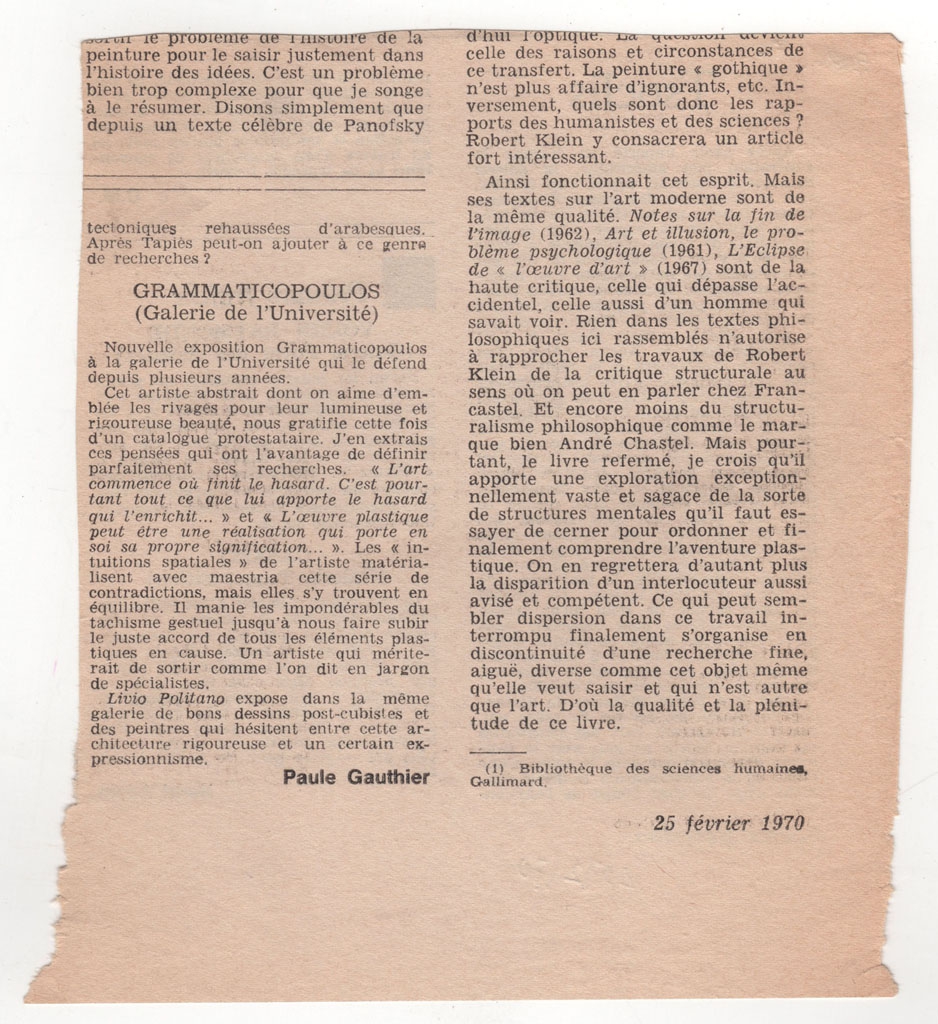 Απόκομμα, έντυπο, χαρτί, 16,5×15,0 εκ., όπου δημοσιεύεται, στα γαλλικά, κριτική του Paule Gauthier για την έκθεση του Γραμματικόπουλου στο Παρίσι το 1970. Στην άλλη όψη, κριτική του C.M. για την ατομική έκθεση του Κ. Τσόκλη και κριτική του Henri Adam για τις έκθεσεις του Raymonde Voisin και του Casabo στο Παρίσι την ίδια περίοδο.