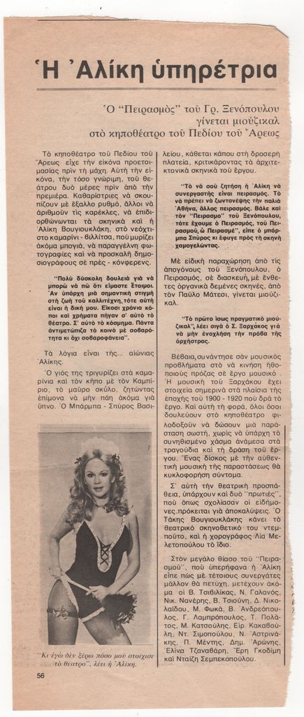 Απόκομμα, έντυπο, χαρτί, στα ελληνικά, όπου δημοσιεύεται άρθρο για την παραγωγή του έργου του Γρ. Ξενόπουλου “Ο Πειρασμός” στην Αθήνα το 1976 με πρωταγωνίστρια την Αλίκη Βουγιουκλάκη, σε διασκευή Π. Μάτεσι, σκηνοθεσία Τάκη Βουγιουκλάκη, χορογραφίες Λίας Μελετοπούλου, σκηνικά Σπύρου Βασιλείου και μουσική του Σταύρου Ξαρχάκου. Στην άλλη όψη, κριτική της Ντ. Ηλιοπούλου Ρογκάν για την ατομική έκθεση του Κώστα Τσόκλη στην Αθήνα το 1976.