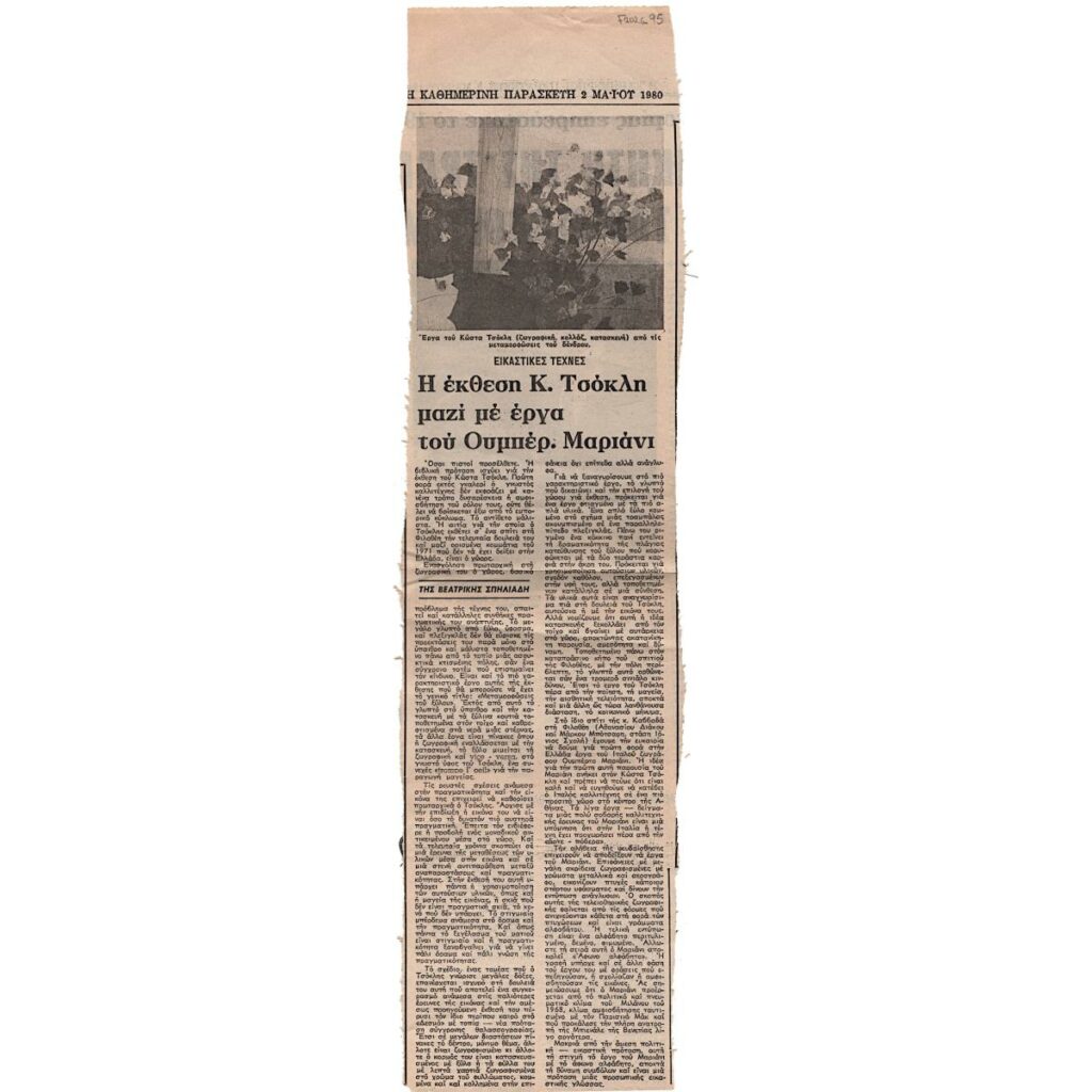 Απόκομμα, έντυπο, χαρτί, όπου δημοσιεύεται, στα ελληνικά, κριτική της Βεατρίκης Σπηλιάδη για την ατομική έκθεση του Κώστα Τσόκλη και την παράλληλη έκθεση έργων του Umbeto Mariani στο σπίτι της κ. Καββαδά στην Αθήνα το 1980.